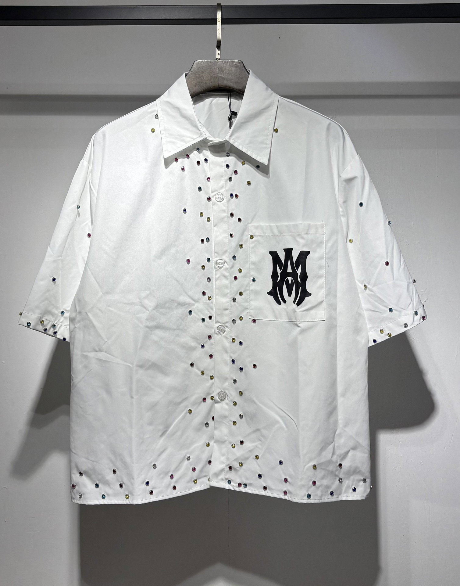 AMIRI color rhinestone pocket Print logo loose short-sleeved shirt White アミリ カラー ラインストーン ポケット プリント logo ゆったり 半袖カジュアルシャツ ホワイト