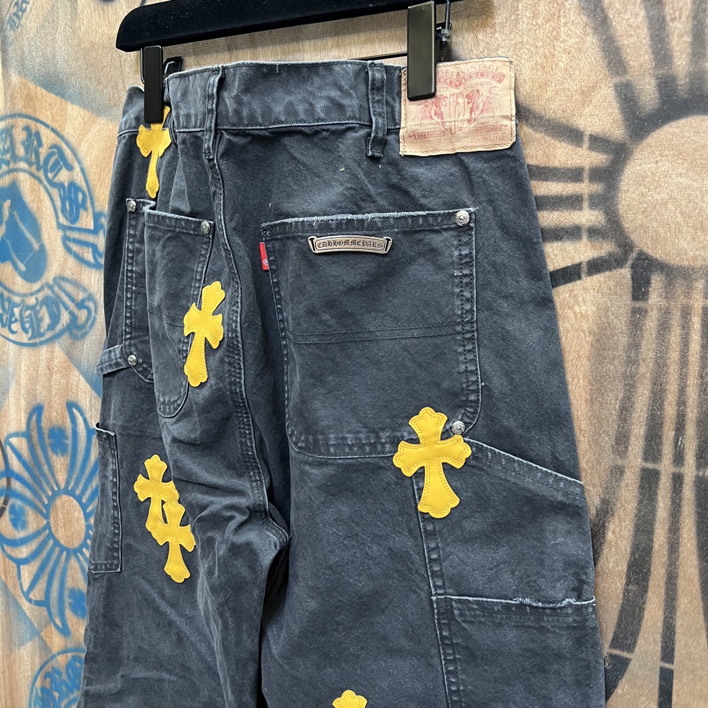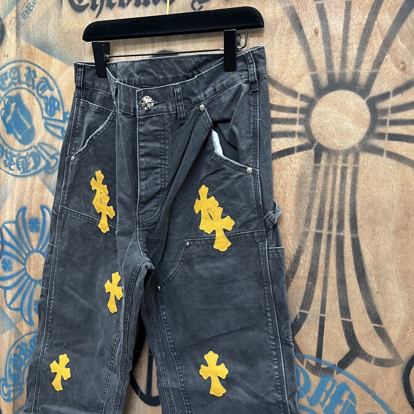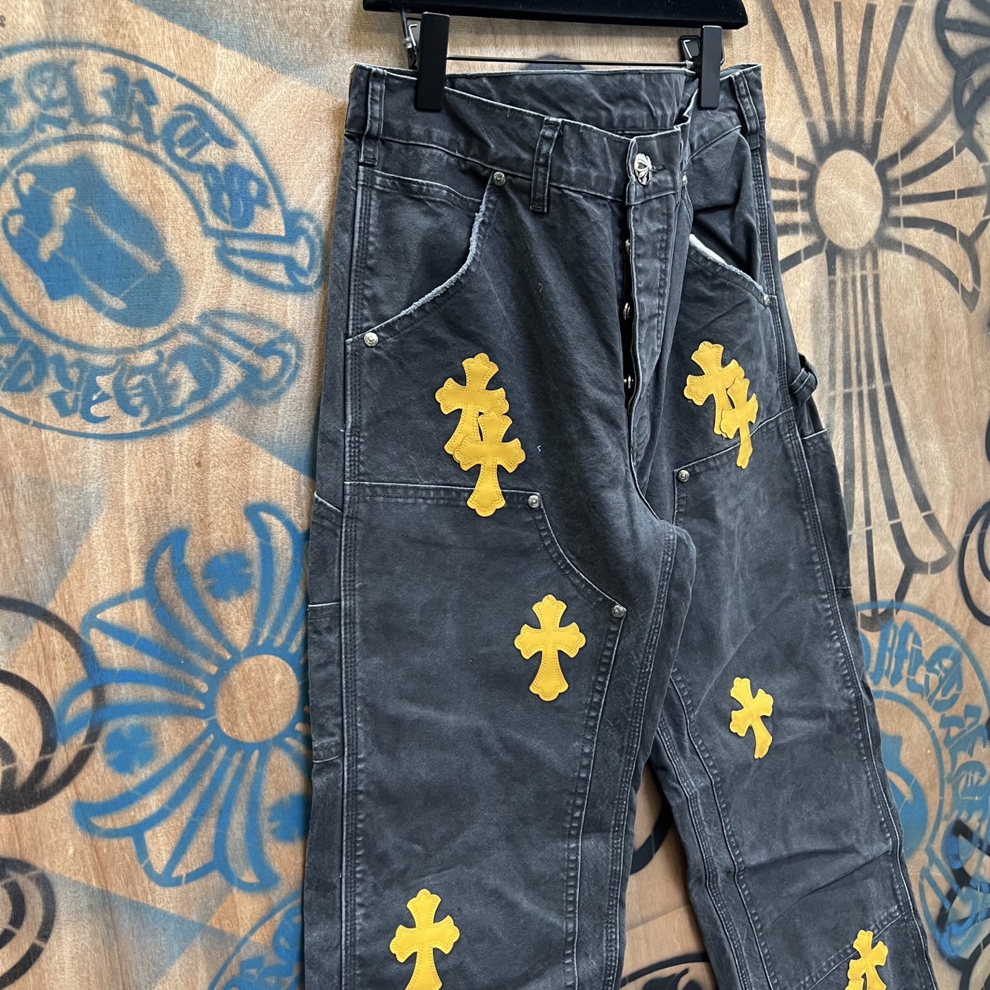 Chrome Hearts patch Print Yellow pattern loose casual DENIM JEANS Washed Black クロムハーツ アップリケ プリント イエロー パターン ゆったり カジュアル デニムパンツ ウォッシュドブラック