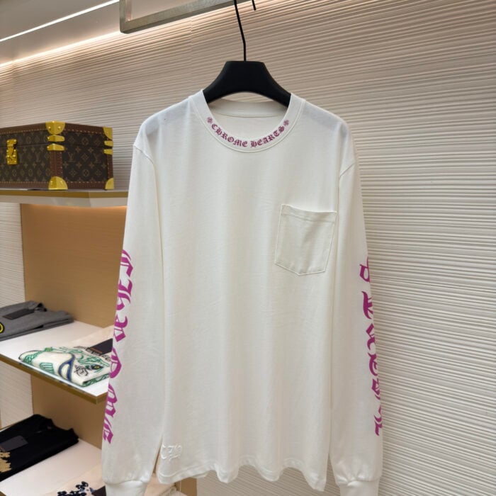 Chrome Hearts pocket Round neck rose red Print pattern long sleeves T-shirt White クロムハーツ ポケット クルーネック ローズレッド プリント パターン 長袖 Tシャツ ホワイト