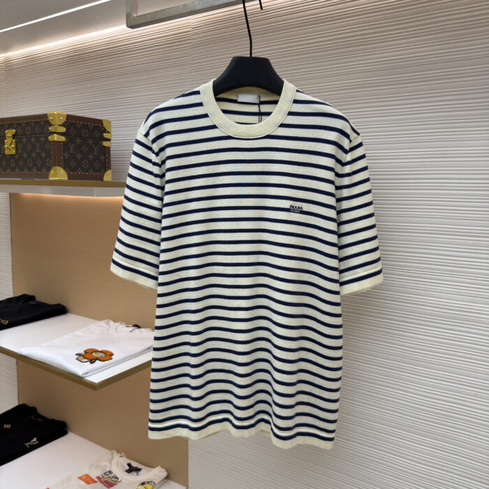 PRADA Embroidery Letter logo stripe Round neck loose T-shirt プラダ 刺繍 モジ logo ストライプ クルーネック ゆったり Tシャツ