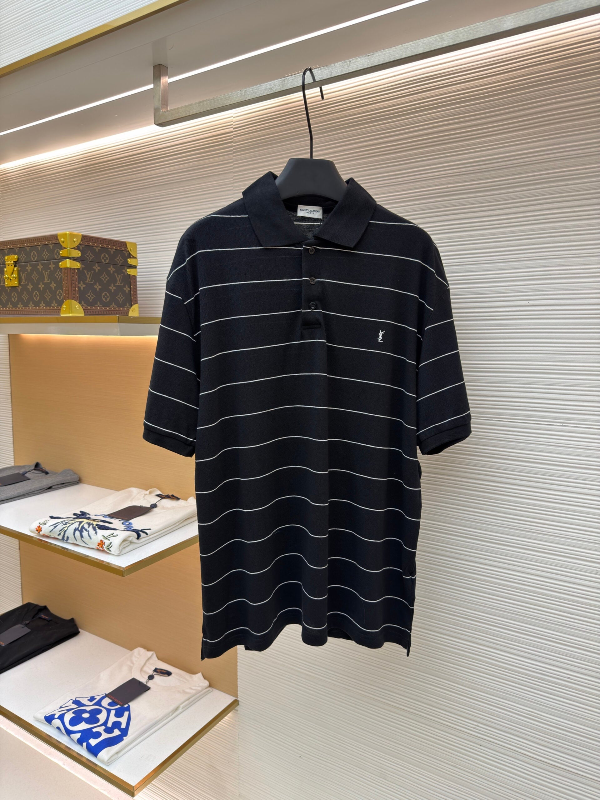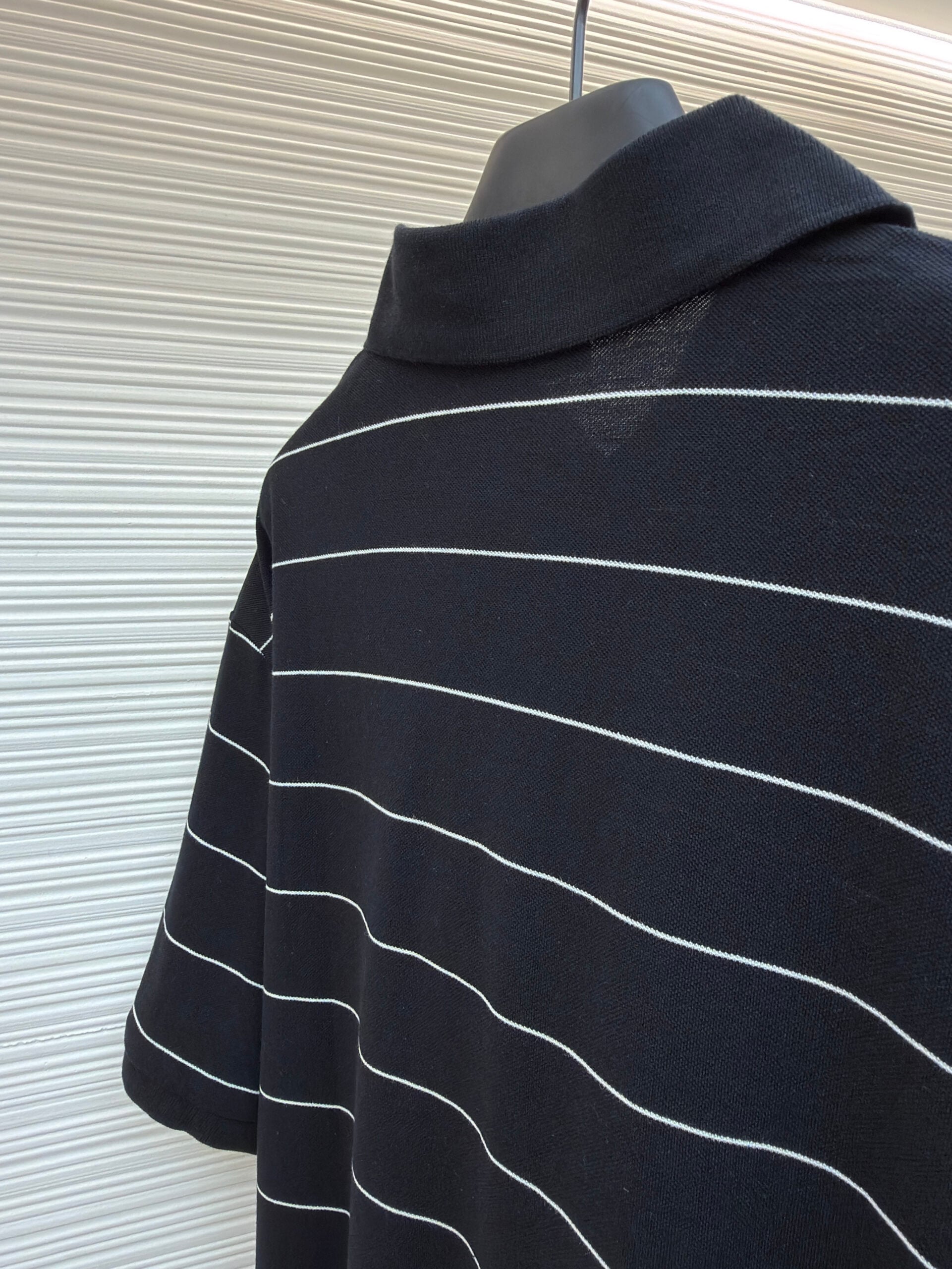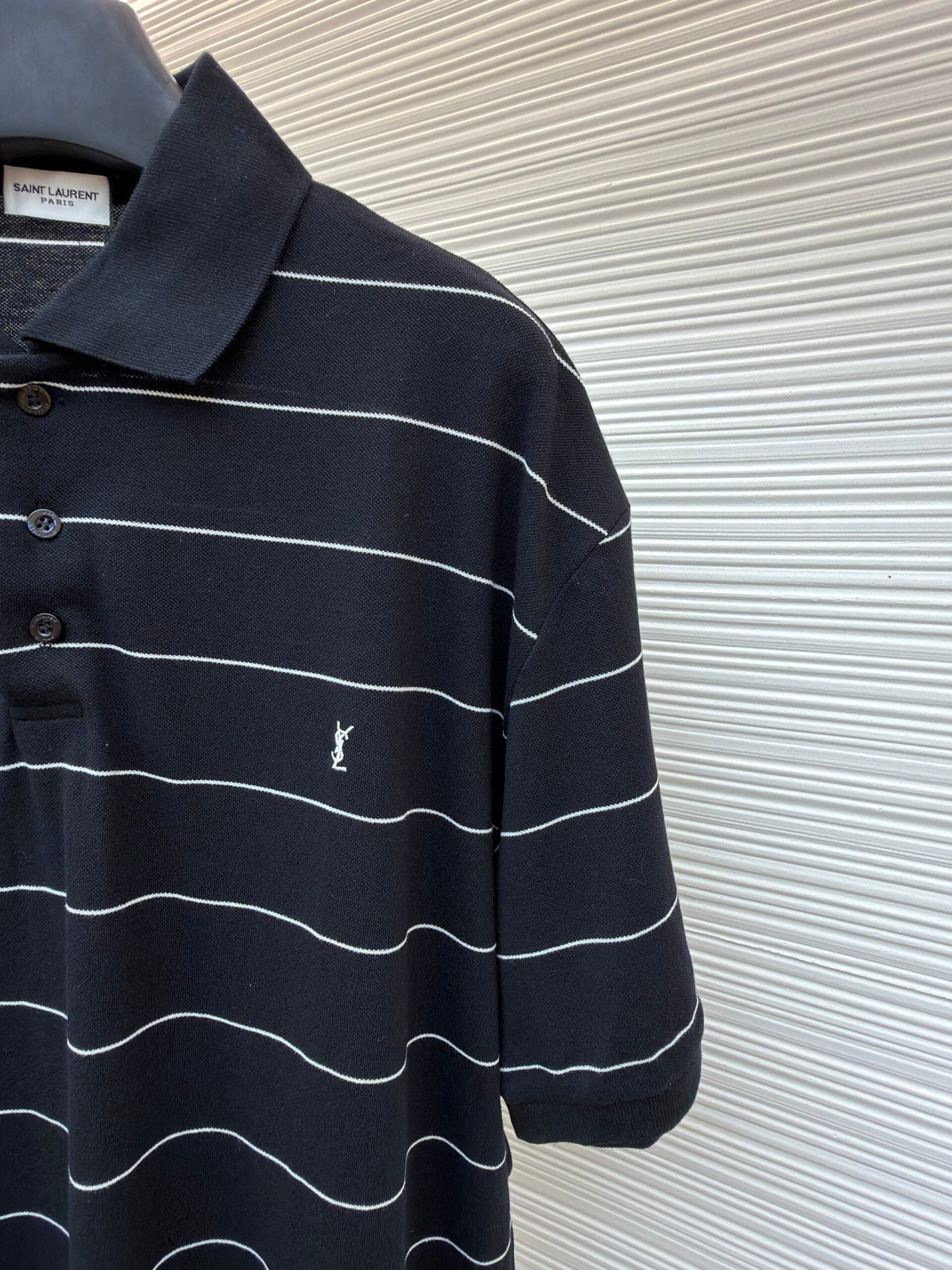 SAINT LAURENT Embroidery logo stripe loose POLO-neck T-shirt Black サンローラン 刺繍 logo ストライプ ゆったり POLO-ネック Tシャツ ブラック