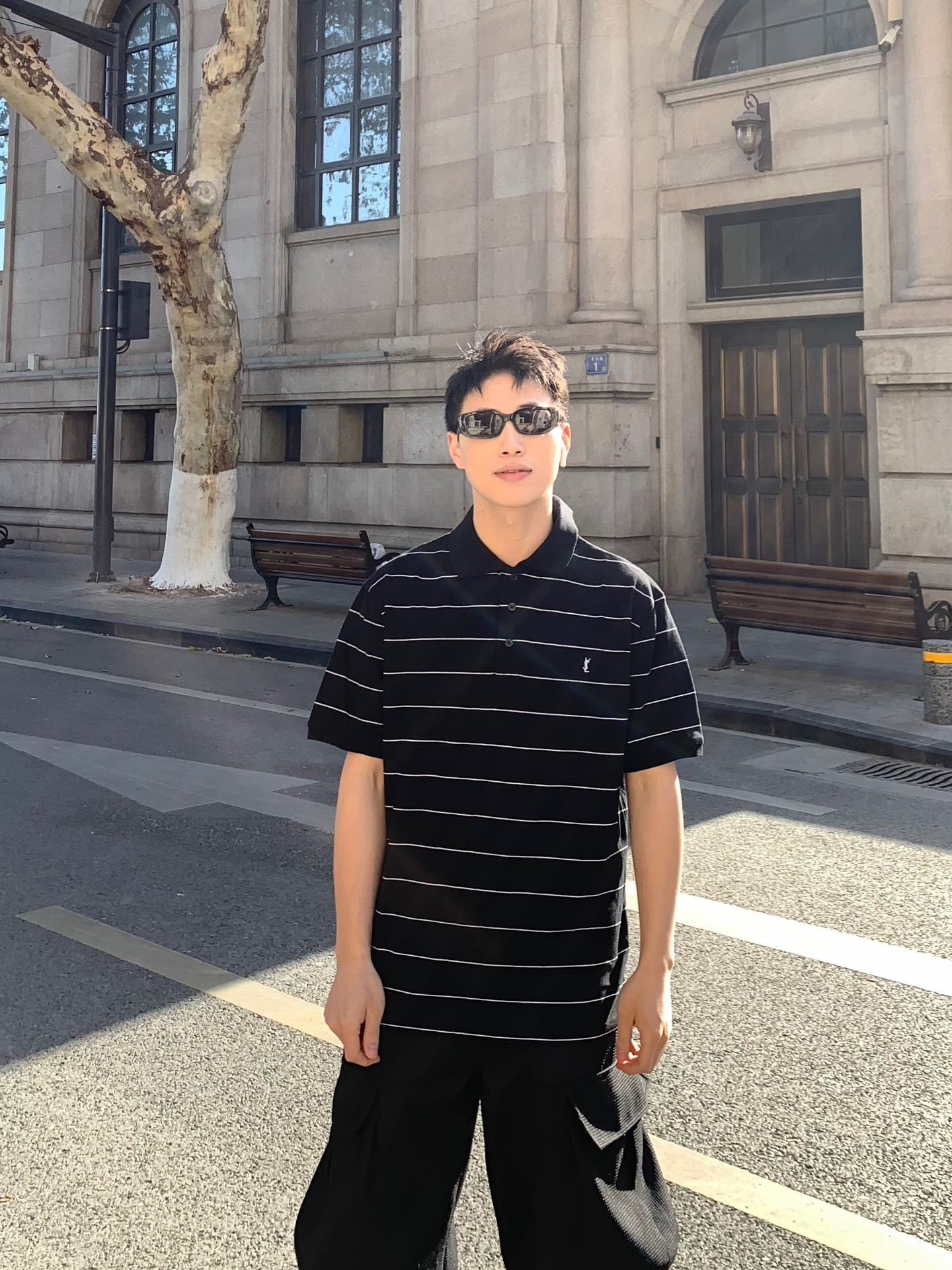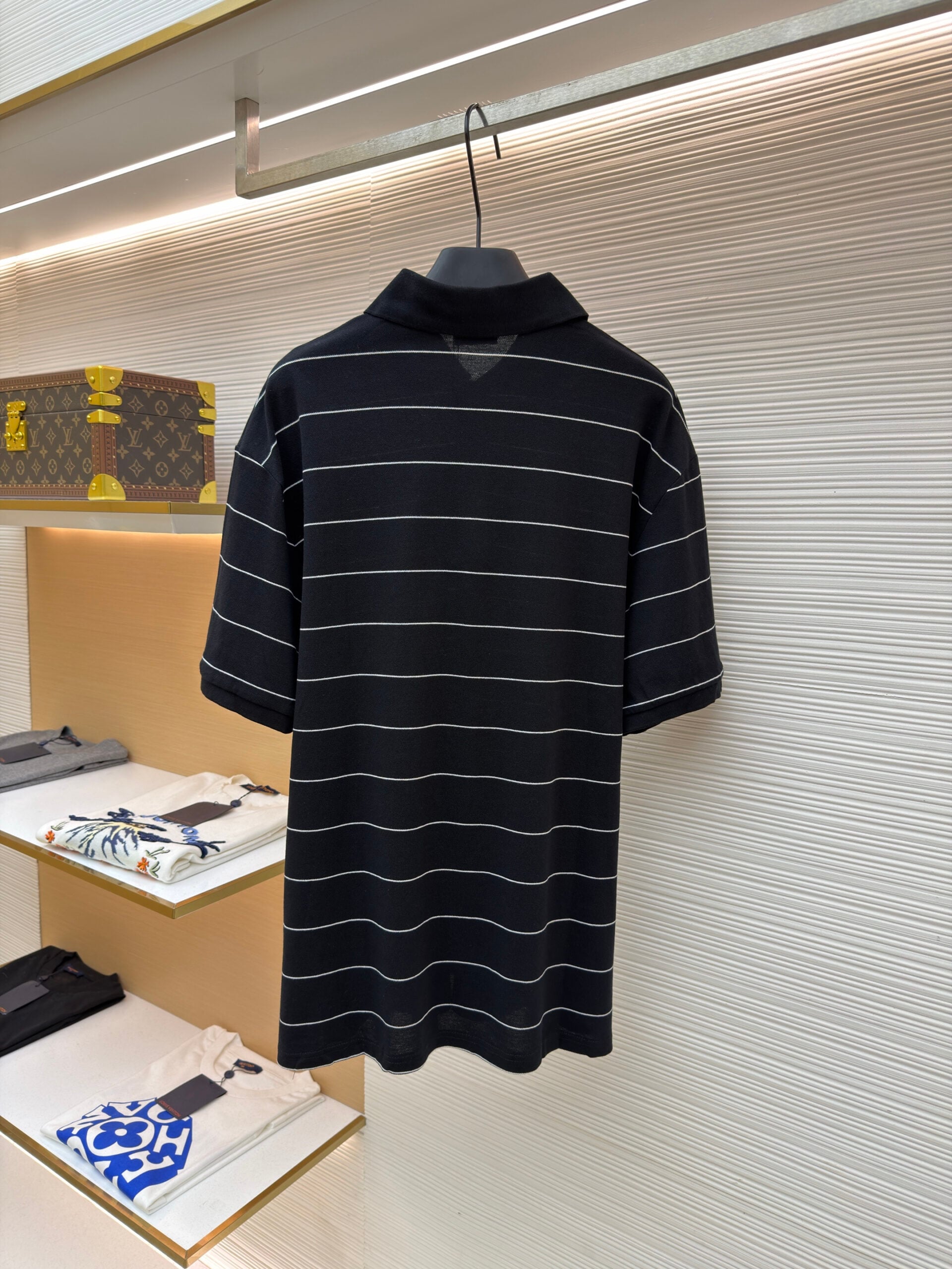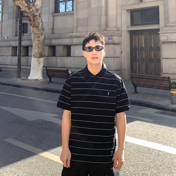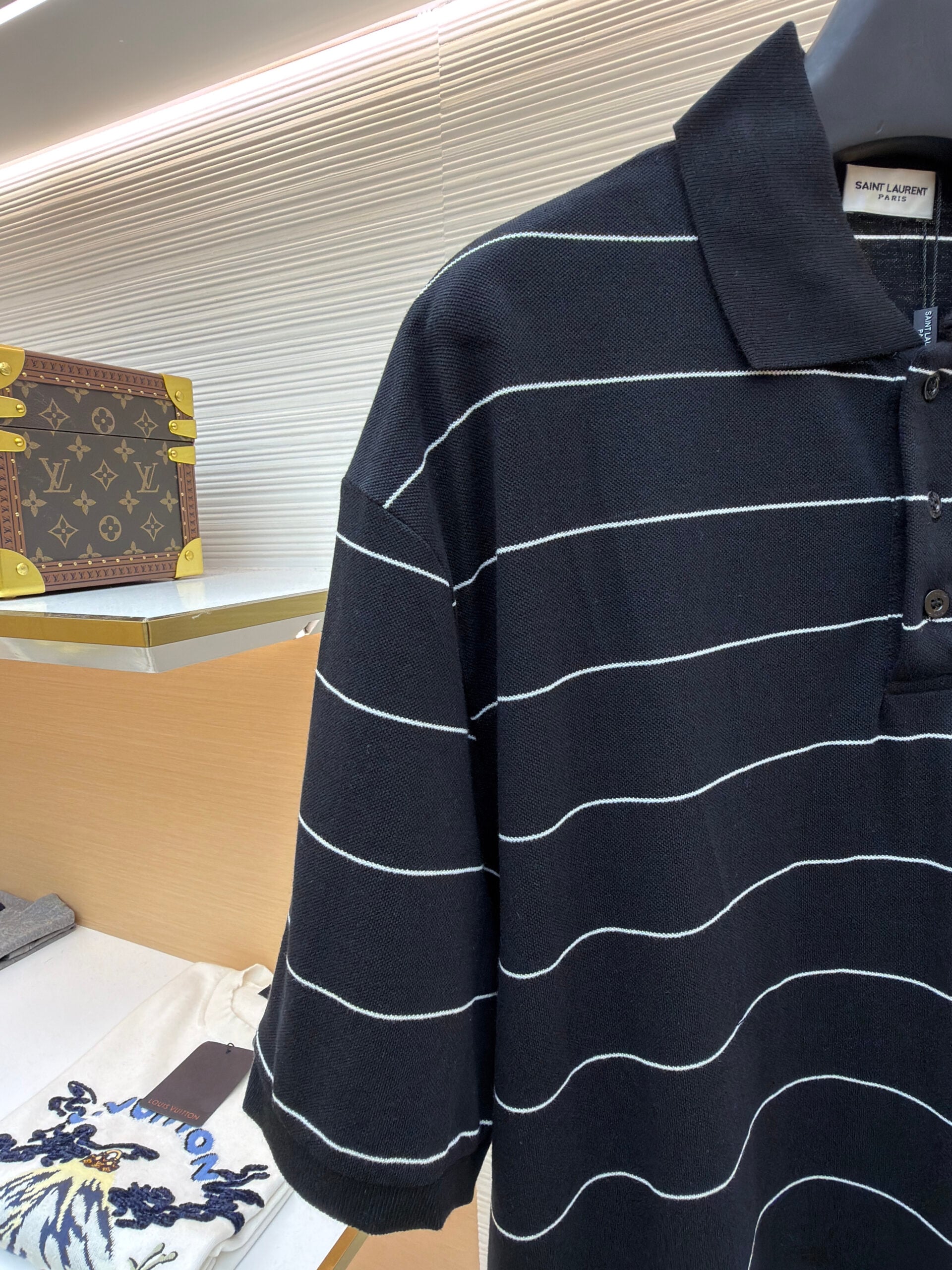 SAINT LAURENT Embroidery logo stripe loose POLO-neck T-shirt Black サンローラン 刺繍 logo ストライプ ゆったり POLO-ネック Tシャツ ブラック