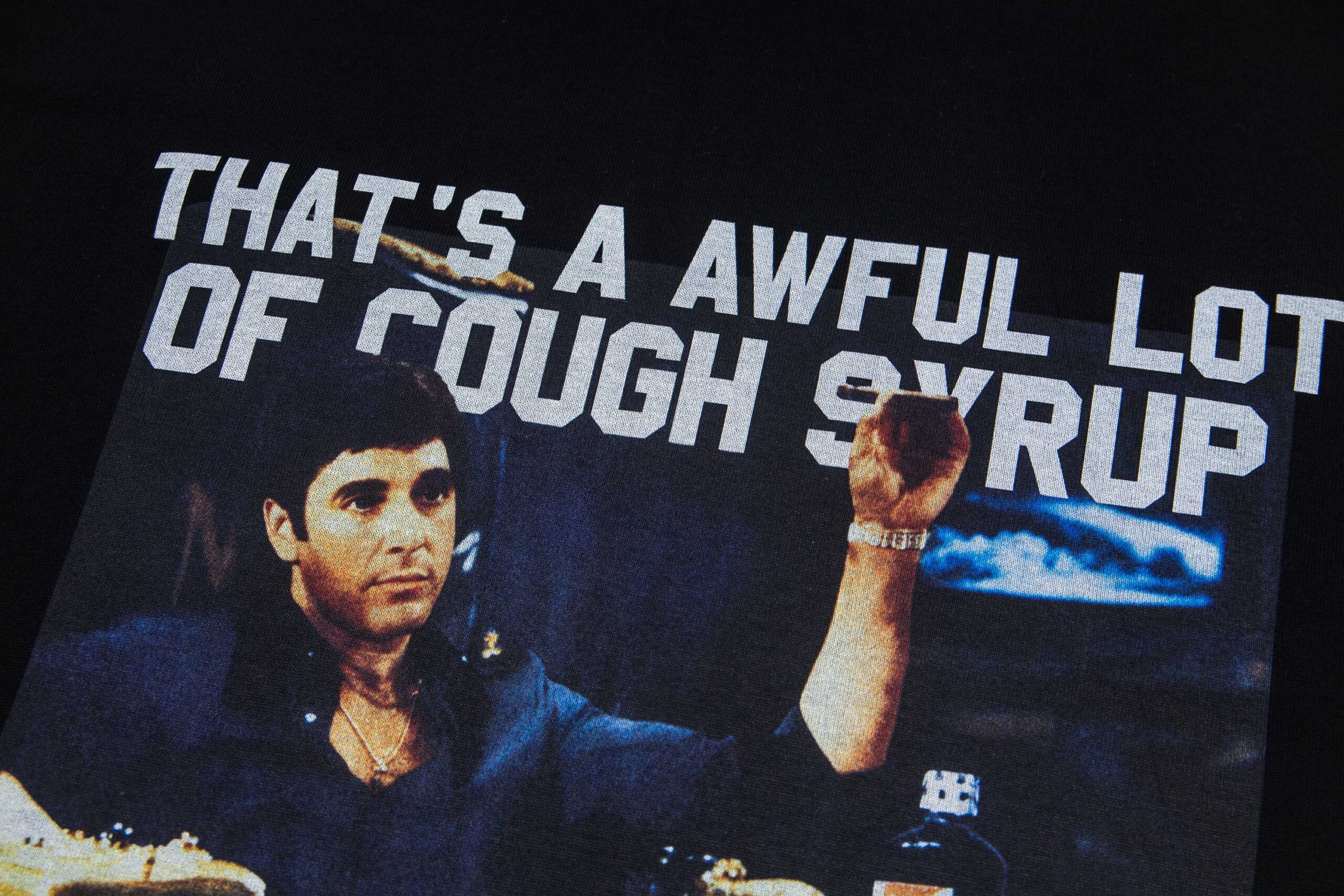 Thats A Awful Lot Of Cough Syrup Print Letter pattern logo loose Round neck T-shirt Black プリント モジ パターン logo ゆったり クルーネック Tシャツ ブラック
