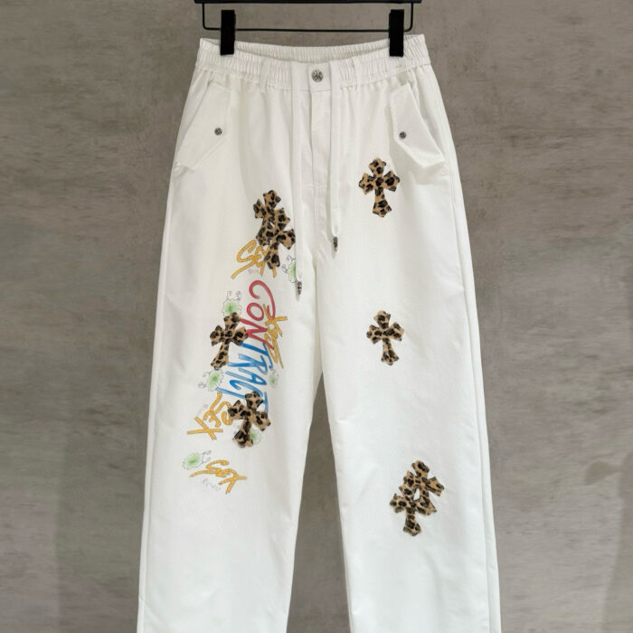 Chrome Hearts クロムハーツ WHITE クロス レザー 刺繍 ホワイト レトロ カジュアルパンツ